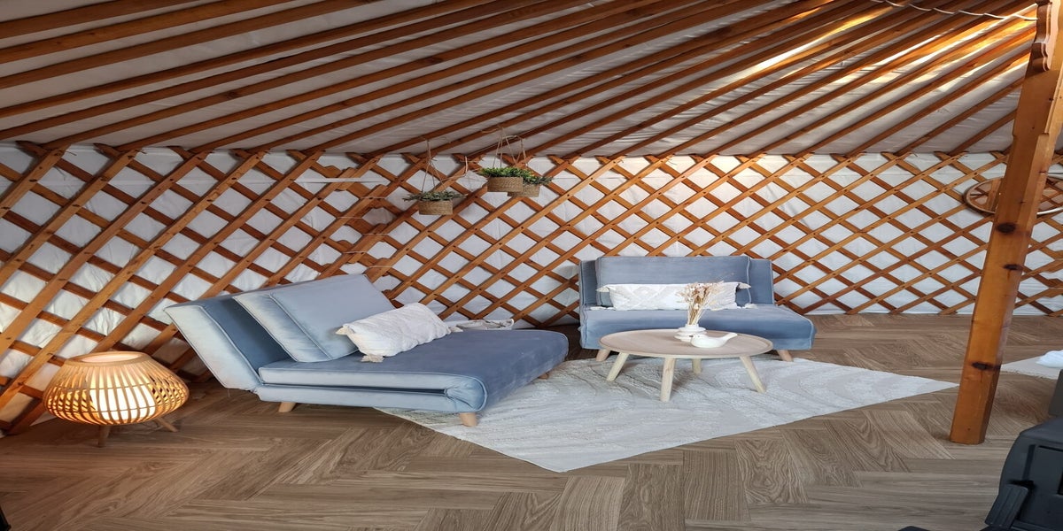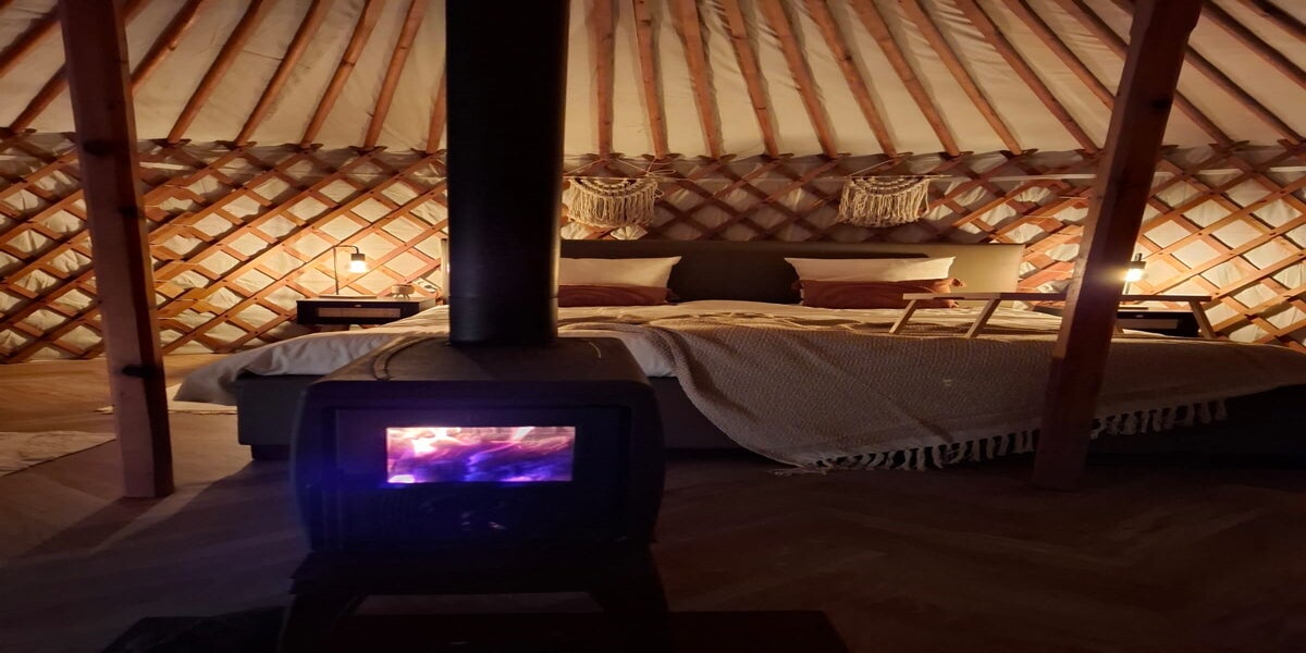 Onze Yurt werd opgebouwd begin september 2024, we kozen voor een goed geïsoleerde waterdichte constructie, met daarin een comfortabele pellet kachel en een lichtkoepel om naar de sterrenhemel te staren.